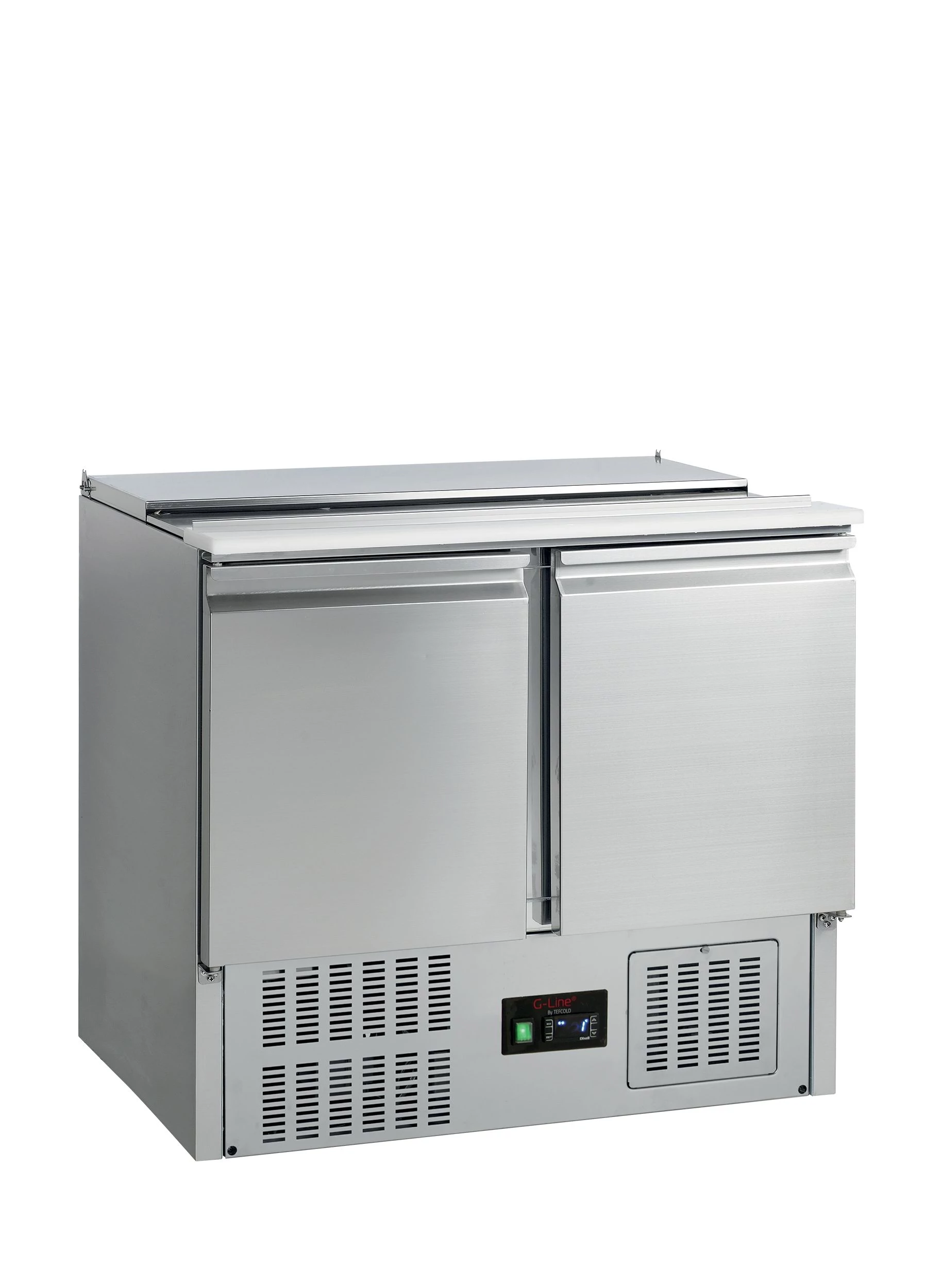 Rozsdamentes salátás hűtött munkaasztal, eltolható tetővel - 2 ajtós