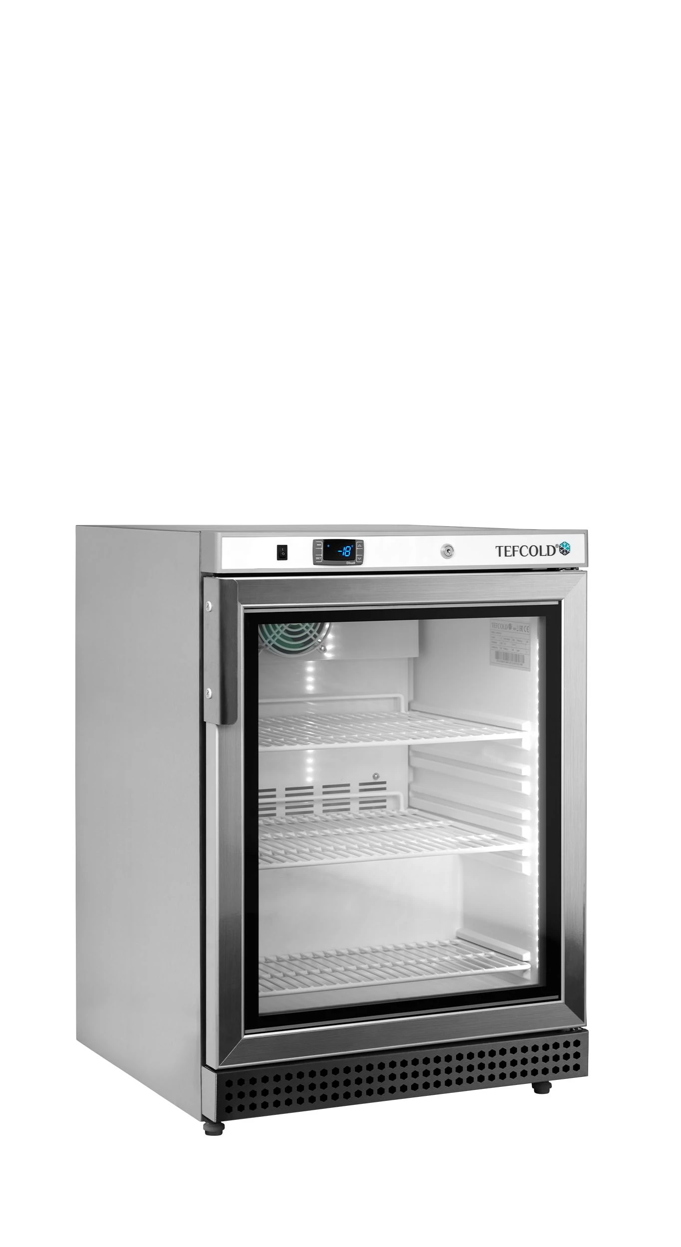 A UF-VSG bemutató fagyasztó család a rozsdamentes acél üvegajtós fagyasztók ventilátoros változata. Többféle méretben elérhető, nagyfokú rugalmasságot kínál állítható polcokkal. A hatékony ventilátoros hűtőrendszer biztosítja az egyenletes hőmérsékletet az egész szekrényben. Az egyszerűen kezelhető digitális termosztáton beállítható a hőmérséklet. Automatikus leolvasztás.
